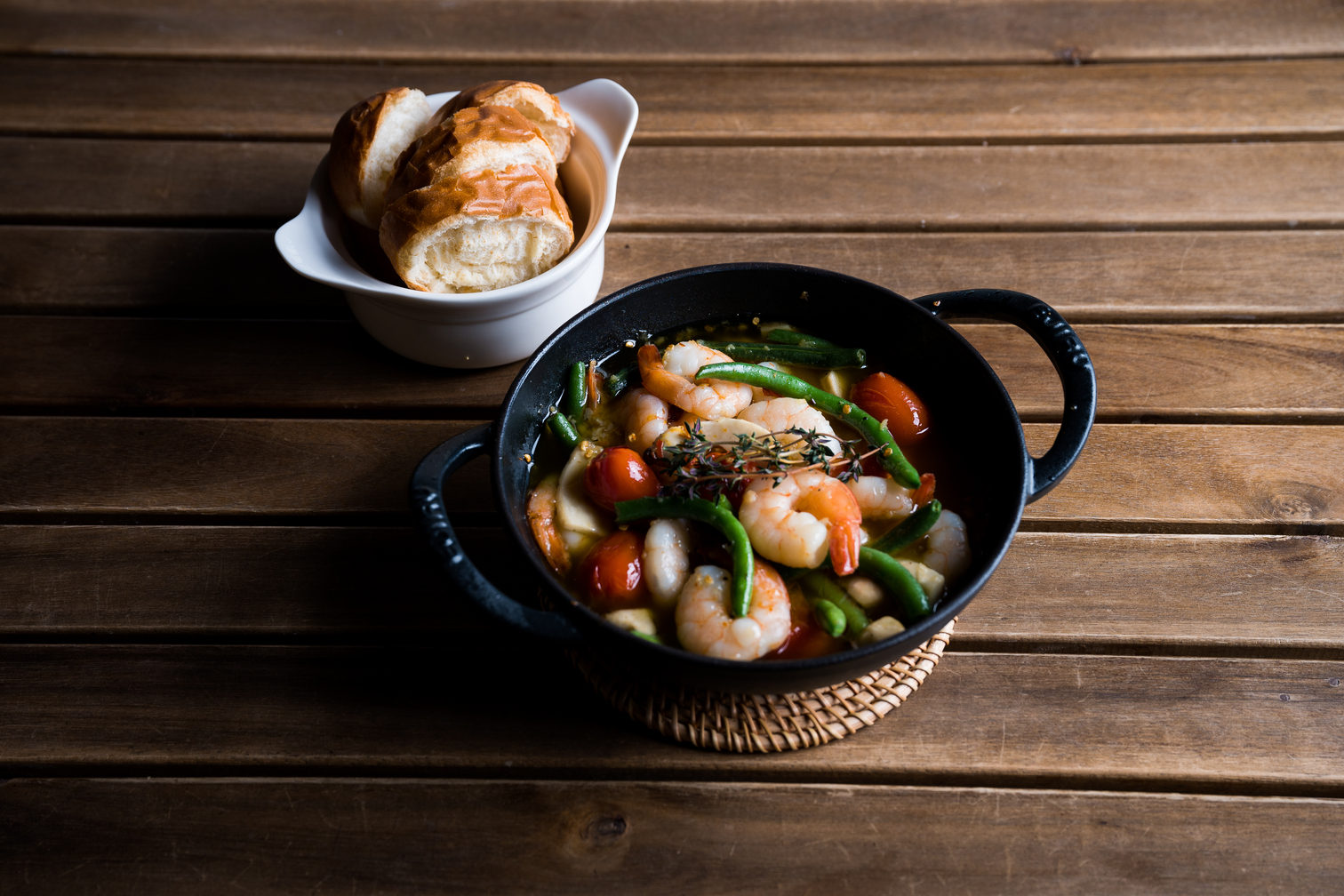 마늘 향 가득한 올리브오일에 새우를 볶은 스페인식 요리. 바게트와 함께 즐기세요.